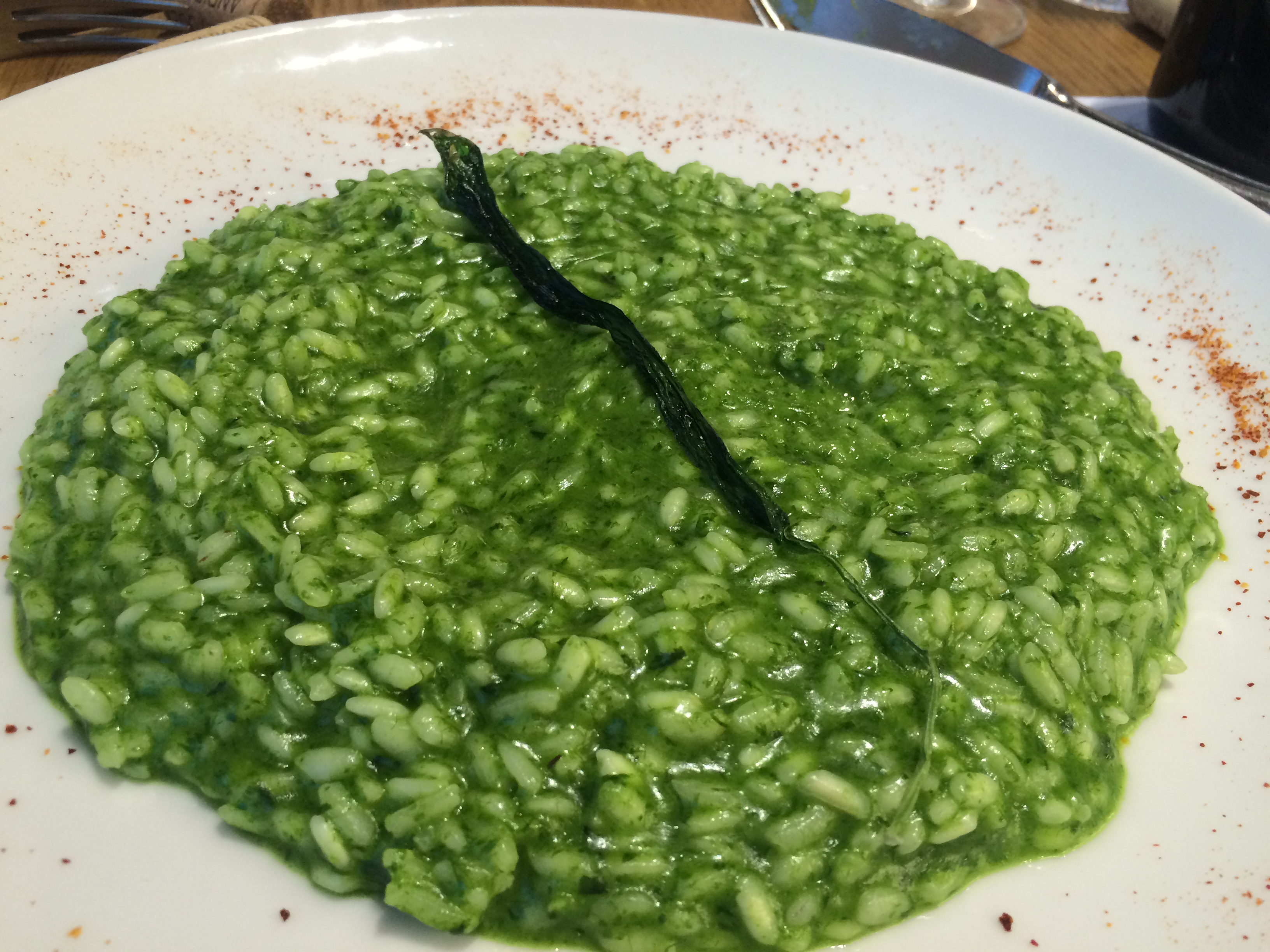 Le risotto à l’ail des ours, cuisson parfaite du riz (un rien al dente), texture assez tendre qui tapisse le palais et ma foi un ail des ours pas si fort que ça. Parmesan bien présent. A nouveau, deux jolis accords :