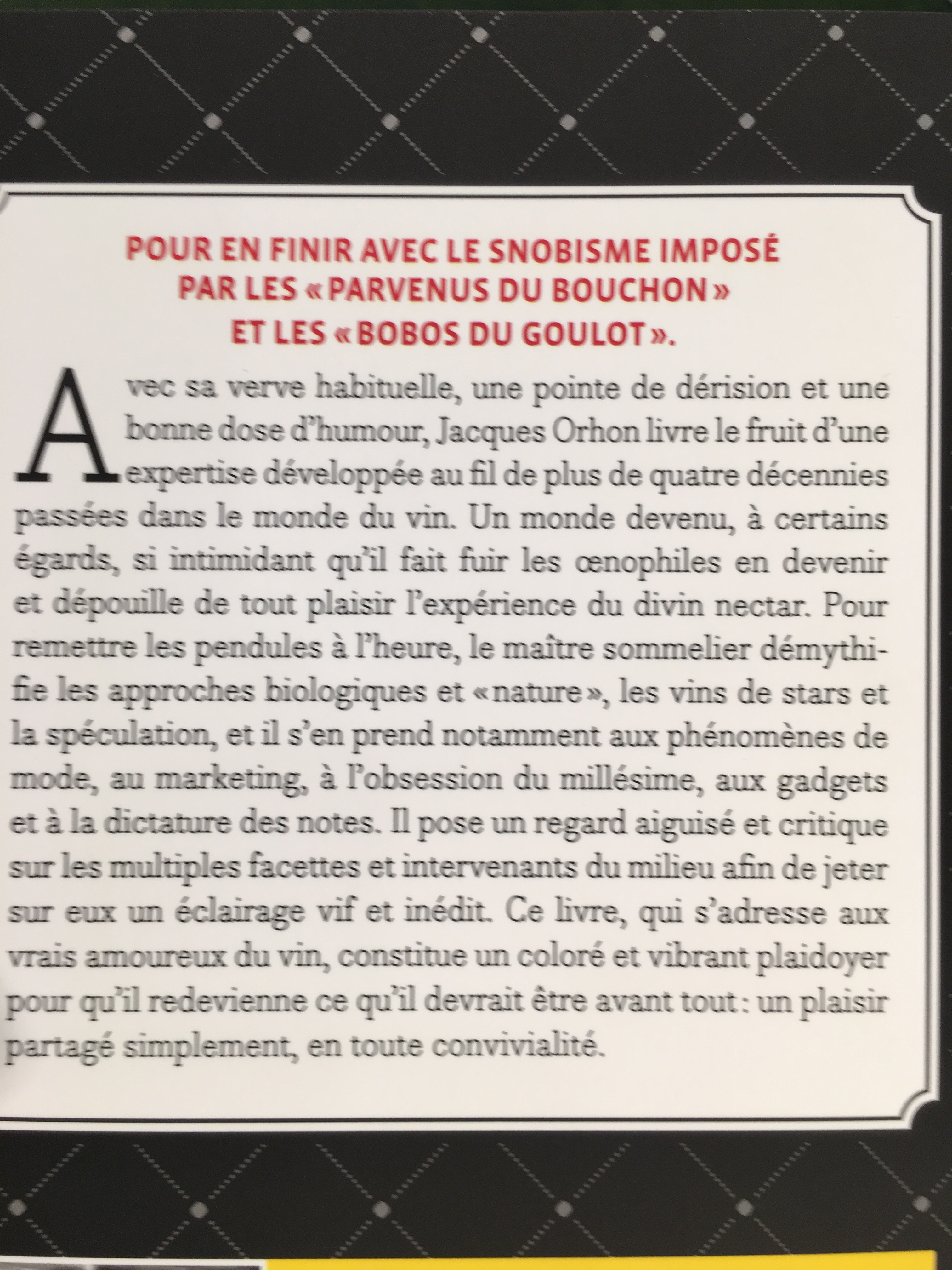 J’aurais aimé acheter et lire le dernier livre de Jacques Orhon « Le vin snob ». Pas parce que je pense que le monde du vin est globalement snob, bien au contraire, mais parce que c’est écrit par un vrai pro avec de longues années d’expérience et que ses précédents ouvrages, plutôt encyclopédiques, ont contribué aux fondements de mon apprentissage dans le vin il y a un peu plus de 20 ans en arrière.