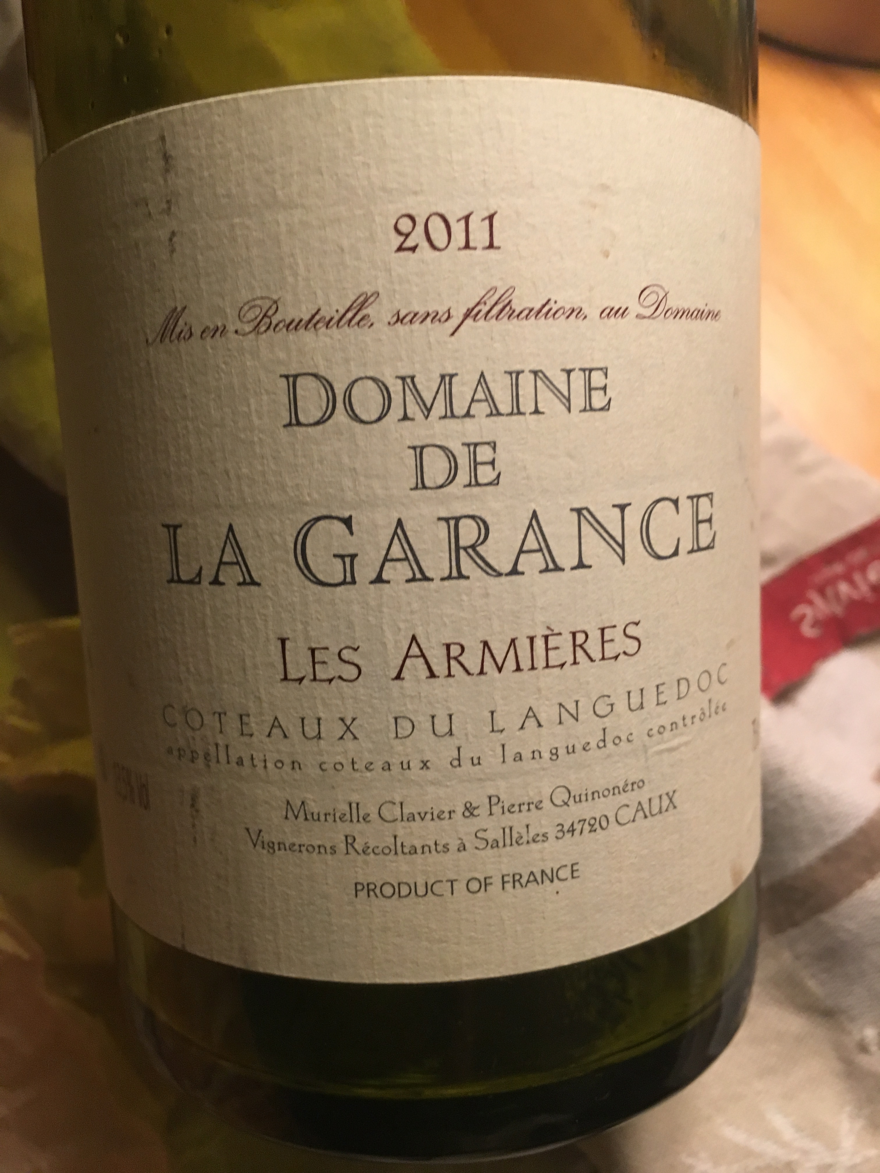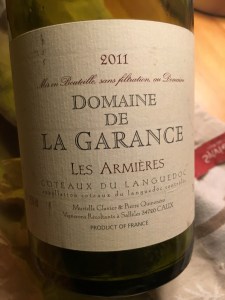 – 100% raisins et vinification naturelle, Les Armières 2011 du domaine de la Garance (Caux, Languedoc) carafé 2 heures avant, est un beau vin, complet, assez intense, ouvert, racé pour un cépage réputé plutôt rustique et doté d’une assez belle longueur et finesse de tanins. Bluffant en fait … Pour autour des 25.00 c’est quand même pas mal. Chez Axel votre sommelier on trouve le 2014, probablement à attendre un peu.