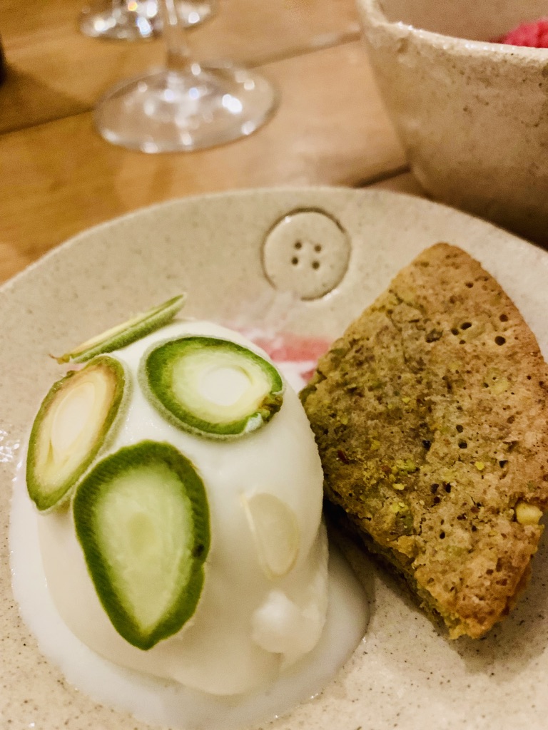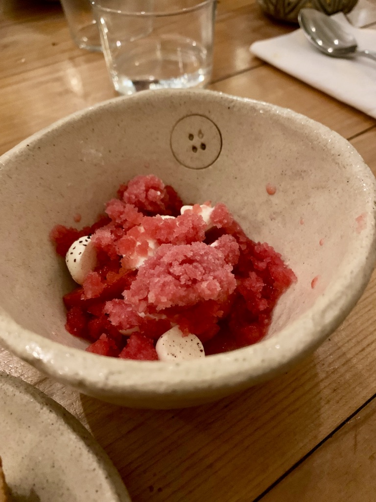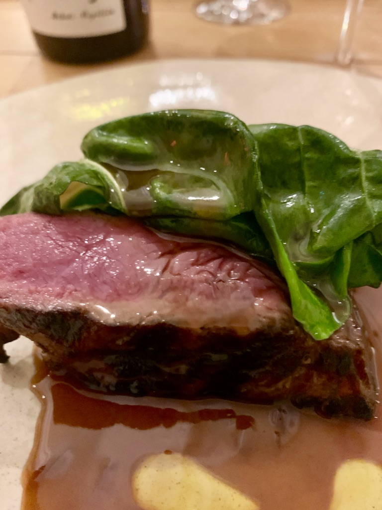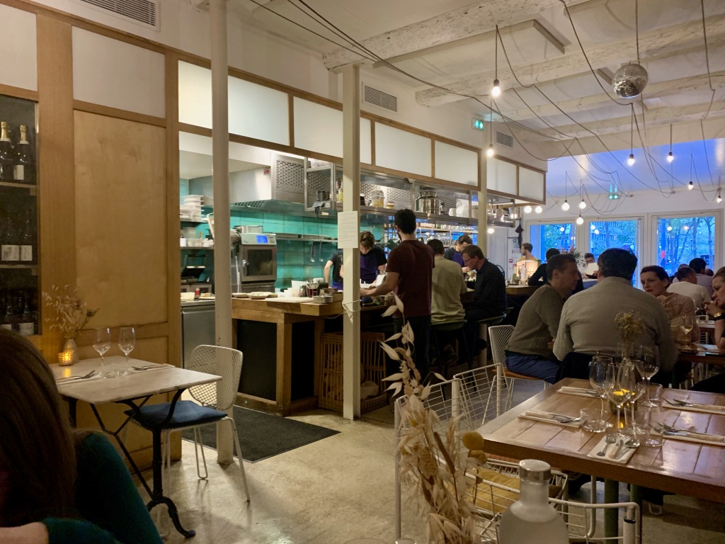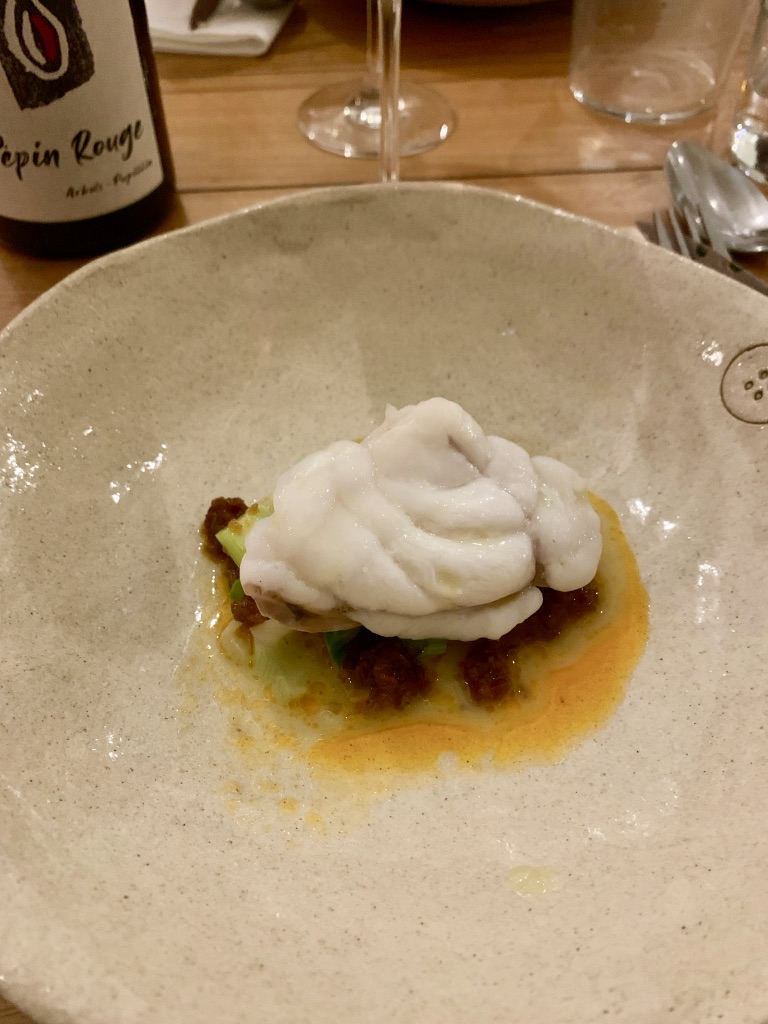 L’approche est tendance avec menu unique le soir à 60 euros avec pour 5 jolis mets, une carte de vins assez inspirée avec une tendance vins naturels (mais pas que) et la cuisine largement ouverte sur la salle.