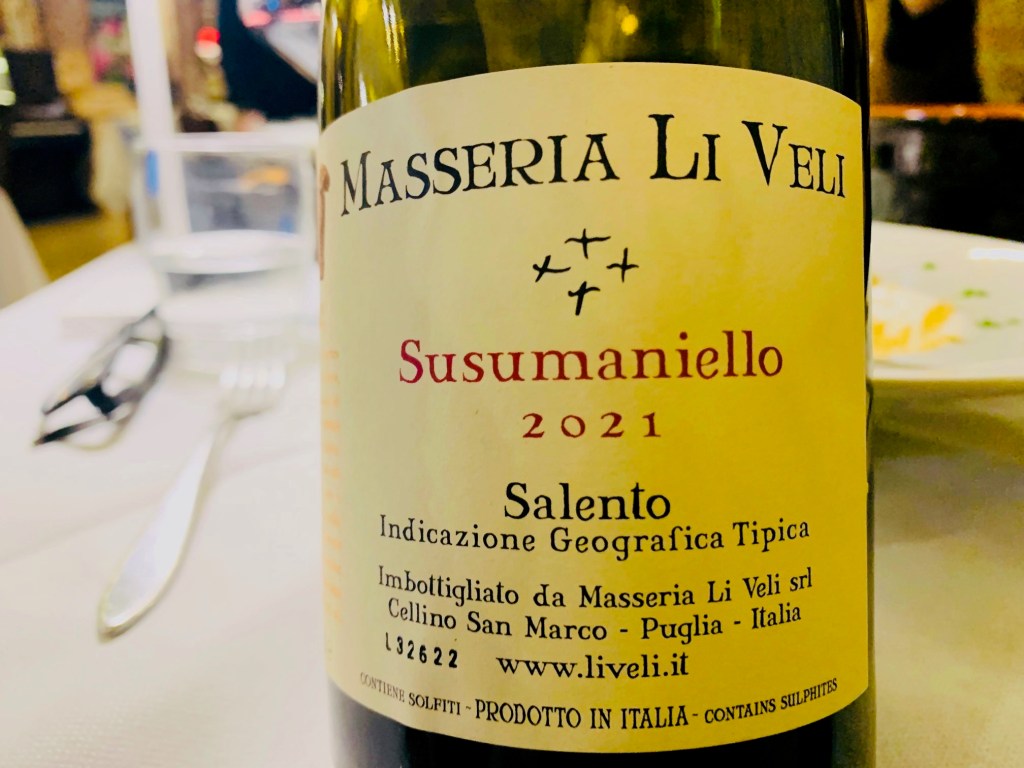 Une mention également pour le sympathique restaurant Enoteca 15 Gradi à Gallipoli. Cuisine traditionnelle et ambiance un rien surannée avec les étagères murales en bois pleines de vin de la région avec quelques incursions en France. Nous y avons découvert le cépage Susumaniello « Askos » 2021 du domaine Li Veli, un joli vin rouge avec de la fraicheur, de l’élégance et de la buvabilité. C’est un ancien cépage quasi uniquement planté dans le Salento et surtout dans le secteur de Brindisi. Il a bien failli disparaitre et était encore récemment uniquement utilisé dans les assemblages. Aujourd’hui le Susumaniello a la vent en poupe et pourrait bien devenir dans la région ce que le cépage Mencia est devenu en Espagne : un pourvoyeur d’une esthétique différente et plus axée sur la fraicheur, la tonicité et une certaine élégance.