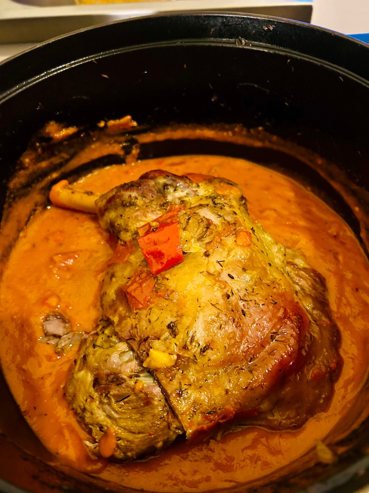 1h00 plus tard sortir la cocotte du four et prélever la moitié du jus et des morceaux de tomates, poivrons .. (jeter les morceaux d’ail et la feuille de laurier)passer au mixeur et réintroduire dans la cocotte et bien mélanger avec le jus non mixé. L’objectif est d’obtenir une sauce un peu épaisse mais pas trop. N.B. Si on mixe tout le jus avec les poivrons etc. on va obtenir un peu comme une purée de légumes et le résultat sera moins dynamique en bouche.